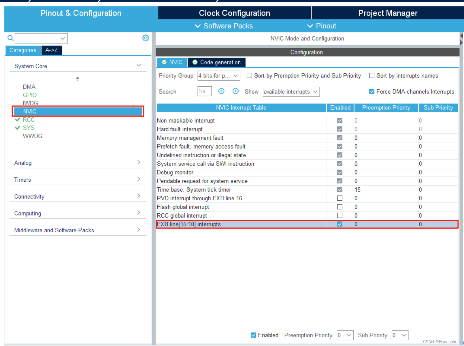 - 点击NVIC勾选 EXIT Line[15:10] interrupt 使能中断