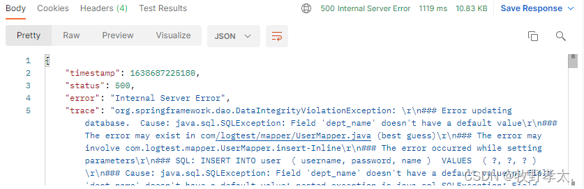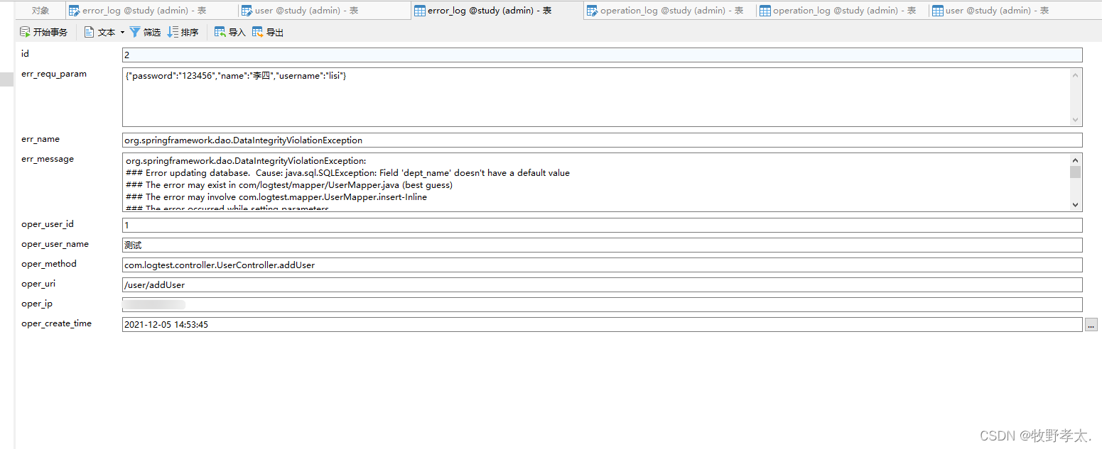 成功写入操作日志,因为我们在设计user表的时候为了方便测试异常日志,我把所有的参数都设为非空了,也就是每个字段都要传,那么我们接下来故意不传其中一个参数试一试