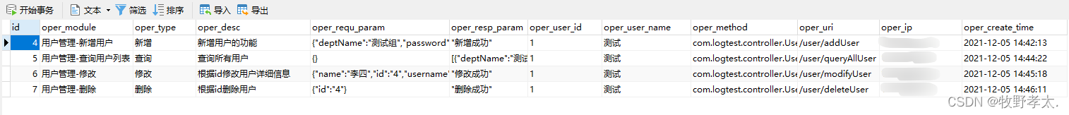 首先我们依次测试一下我们写的四个方法,测完后我们去看一下数据库中的操作日志表