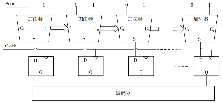 我们设计一个特殊的加法器串。正常情况下,它在算 111...111 + 000...000,结果是 111...111,风平浪静。但就在某一瞬间,我们给它一个“开始”信号(Start),让它突然开始算 111...111 + 000...001。这个小小的“1”,就像推倒了第一块骨牌,一个“进位”信号会从最低位开始,一级一级地向高位“链式传递”。这个“进位”信号在链上传播的距离,就代表了从“开始”到“现在”过去了多少时间。