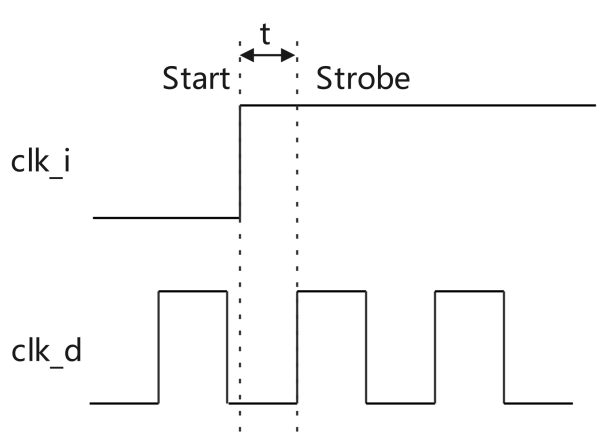 我们用了一个很巧妙的方法——码密度法,听起来高大上,其实就像……数豆子!我们让 Start 和 Strobe 信号变成两个不同频率的、不相关的时钟(clk_i 和 clk_d),拍照的频率要显著大于 Start 对应时钟的频率(可以理解为骨牌重新摆放好的操作频率),然后持续反复的摆好、推倒、再拍照。这样操作的目的是为了保证每次拍照的传播时间是随机的,也就是下图中的 t 是在 [0, Tc) 之间随机分布的,Tc 是 clk_d 的周期,也就是拍照的周期。