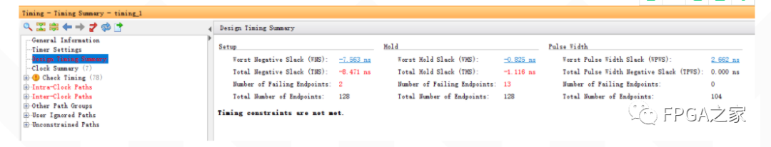 其中Design Timing Summary是时序概况,包括最大延迟分析、最小延迟分析以及脉冲宽度三个部分。其中WNS或WHS为负数,说明当前设计无法满足建立时间或保持时间要求,也就是说数据无法被稳定采样。
