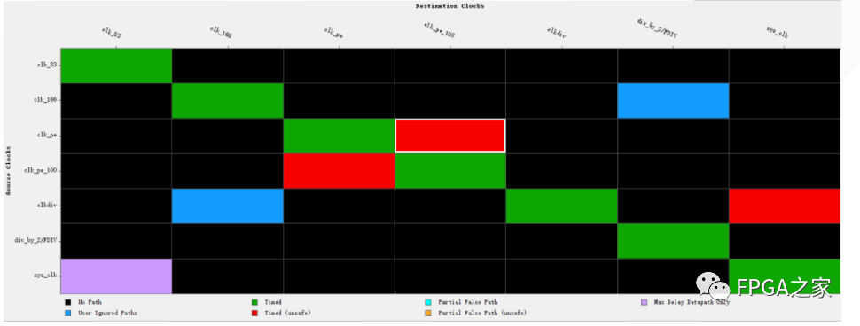 键入该命令后,会生成时钟交互矩阵。对角线是每个时钟内部路径,其他非黑色部分即为存在对应两个时钟的跨时钟域路径。红色部分是非安全路径,若不处理会产生亚稳态。
