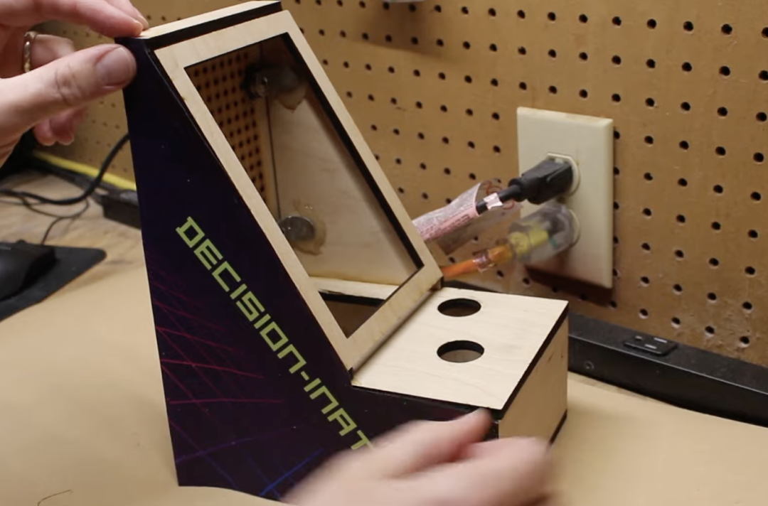 Makerinator 自认不是专业木工,其自我调侃道,“要是我高中的手工课老师看到这个,他大概会撤销我的文凭”,但他依然用激光切割完成了所需的胶合板,并打造了一个迷你街机风格的机箱来安置 Decisioninator,组成一个方方正正的框架。成品不好看,但确实能用。