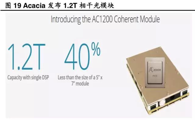 案例:苏州旭创、光迅科技、美国Acacia专注细分打造龙头。(1)苏州旭创以SDH电信光模块起家,2012 年战略重点转移数据中心市场,2016年,公司发布100G产品,其100GCWDM4迅速成为北美市场“爆款”。2018 年,公司推出400G QSFP-DD和400G OSFP,在全球数通光模块领域出货量第一。(2)光迅科技自成立之初专注于电信 市场,推出了 OTN、FTTH、PON 各场景的光模块产品组合,成为华为、中兴等电信设备商的主要供应商,2018年公司电信光器件和光模块销售额稳居国内第一位,全球第四位。(3)Acacia 成立于 2009年,是全球相干光模块的领军企业,通过硅光子解决方案 和专有DSP芯片的研发,Acacia 不断巩固在相干市场的领先地位。