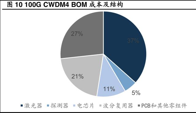 光模块芯片具有极高的技术壁垒和复杂的工艺流程,因而是光模块 BOM成本结构 中占比最大的部分。光芯片的成本占比通常在40%-60%,电芯片的成本占比通常在10%-30%之间,越高速、高端的光模块电芯片成本占比越高,但规模优势可以增加采购的议价能力。