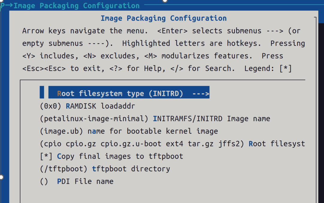 2.petalinux-config->Image Packaging Configuration->Root filesystem type进行文件系统类型选择,这里使用INITRD类型;