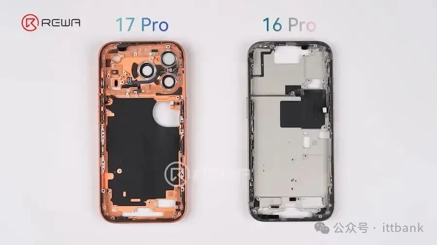 同时 iPhone 17 Pro 整个铝合金一体成型机身整合了更多信号天线,讯号表现比过去更稳定,REWA 认为这次 Pro 机型在这块铝合金机身设计成本更高,壳内加入大量锁定孔,要是想单独换机壳相对就不划算。