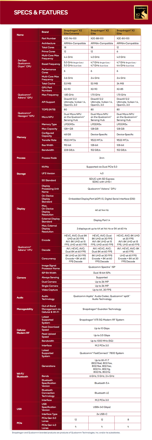 基带集成骁龙X75,峰值下行速率10Gbps、上行速率3Gpbs,支持Wi-Fi 7、蓝牙5.4、蓝牙LE,接口支持USB4、三个USB-C,扩展支持12条PCIe 5.0和4条PCIe 4.0(X2E-80-100降级为8条PCIe 5.0)。