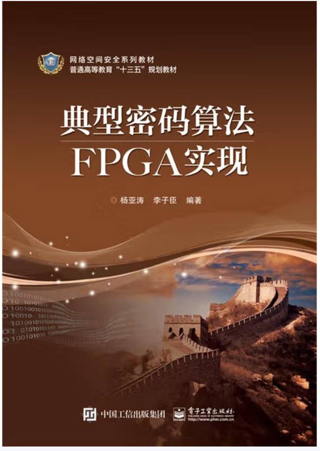 《典型密码算法FPGA实现》正是在这种背景下诞生的一本实践型教材。由北京邮电大学杨亚涛副教授与李子臣教授联合编著,本书于 2017 年由电子工业出版社出版,是“网络空间安全系列教材”与“十三五”规划教材之一。全书系统地介绍分组密码、公钥密码、Hash、数字签名等典型密码算法的 FPGA 实现,是一本兼具学术深度与工程可操作性的密码硬件开发手册。