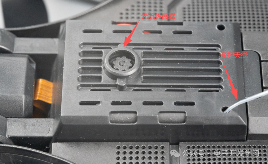下面也有一个镜头是光流传感器。另外还伸出了一根遥控的2.4G天线。