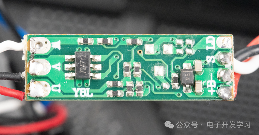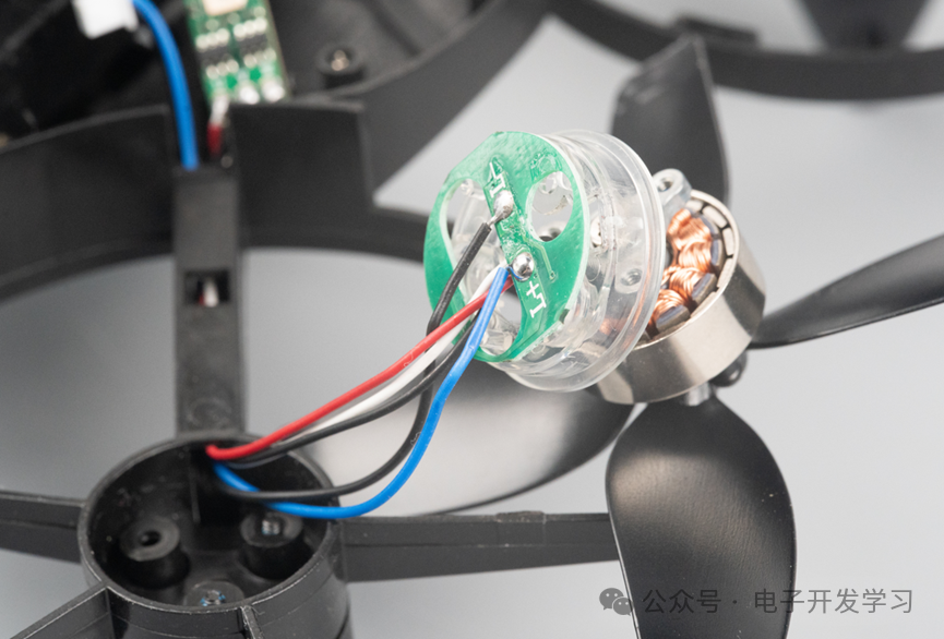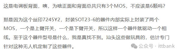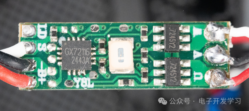 接下来看一眼电调。电调上用了一颗GX71226,这器件我没搜到是什么型号,理论上应该是一颗单片机,接收PWM信号然后驱动6个MOS管组成的三相H桥,来驱动直流无刷电机。