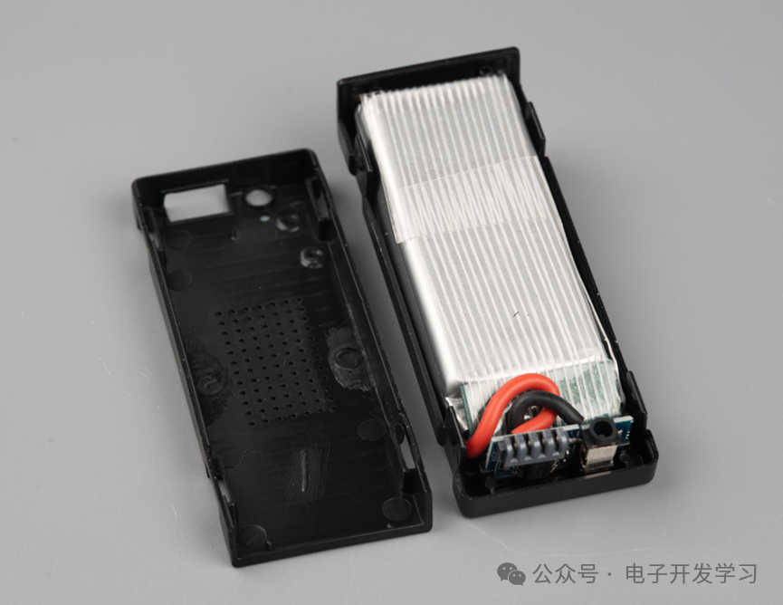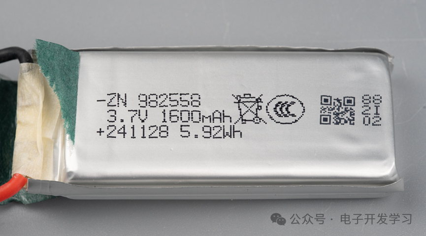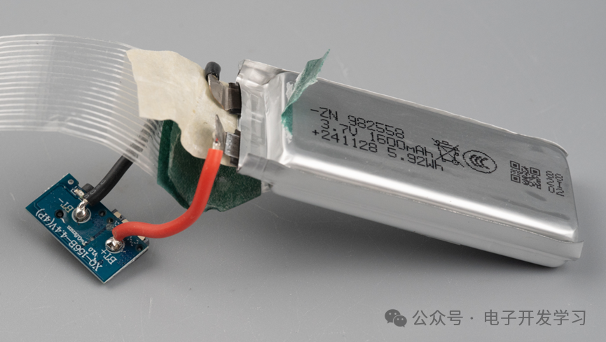 电池上下盖之间采用卡扣结构,没有任何螺丝。开盖之后可以看到里面也是聚合物锂电池。