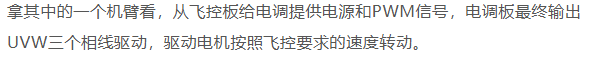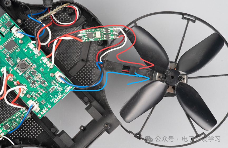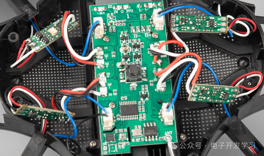 仔细看,从飞控到每个电调板,都有三根线,分别是红色电源、黑色地、白色PWM信号。另外,飞控到每个机臂还有黑色和蓝色的两根线,这显然是连接到机臂LED灯了。