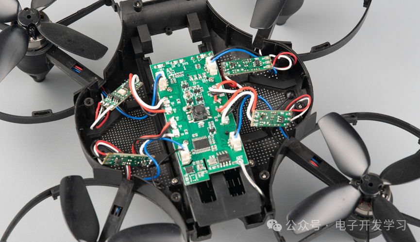 接下来就拆开外壳。这时候可以看到的绿色板子就是飞控板。