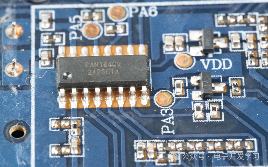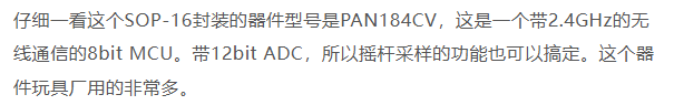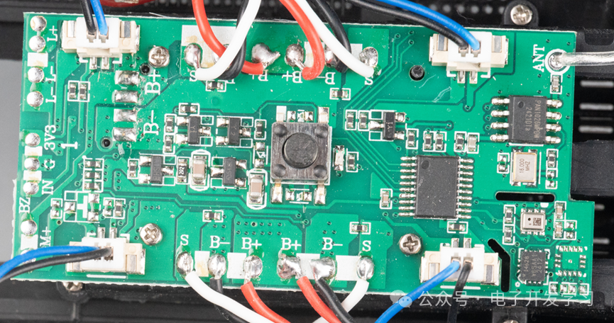 飞控中间是开关机按键。MCU是一颗SSOP-20封装的单片机。2.4G射频遥控用的是PAN1026,这是一个SOP-8封装的GFSK协议的射频芯片。