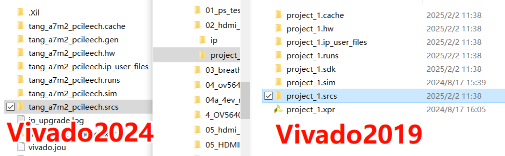 源文件和生成文件全部混在同一个 .srcs 目录中。