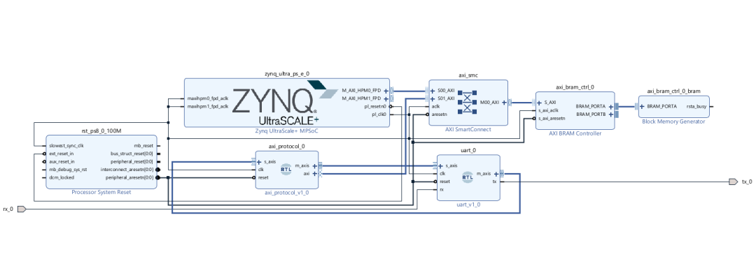 此外还加入了 自定义 RTL 文件,通过 UART 提供 AXI 访问,用来演示 自定义 RTL 与 IP 设计共存 的情况。