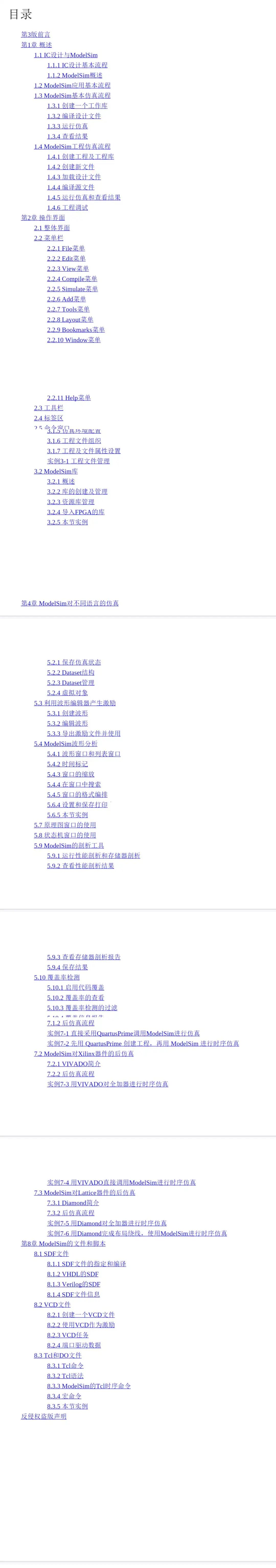 全书由浅入深,围绕 ModelSim 的实际使用流程展开,内容涵盖 基础操作、工程管理、多语言仿真、仿真分析与协同仿真 等多个方面。
