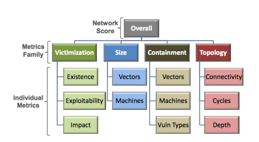 Cauldron的作者Noel S.和Jajodia S.在2014年一篇文献中对攻击图度量的指标进行了分簇,如下图所示: