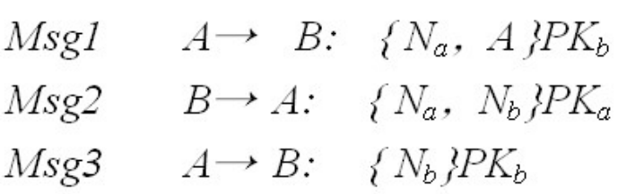 NSPK协议提供了对主体双方的双向认证。主体A和B交换各自的随机数Na、Nb,从而共享Na和Nb,并将其结合以生成一个新的会话密钥。PKa和PKb分别为A和B的公开密钥。