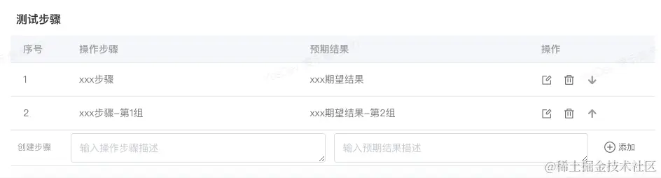 针对,测试步骤,除了支持录入多组,也可以快速进行上移、下移、添加、删除和编辑。
