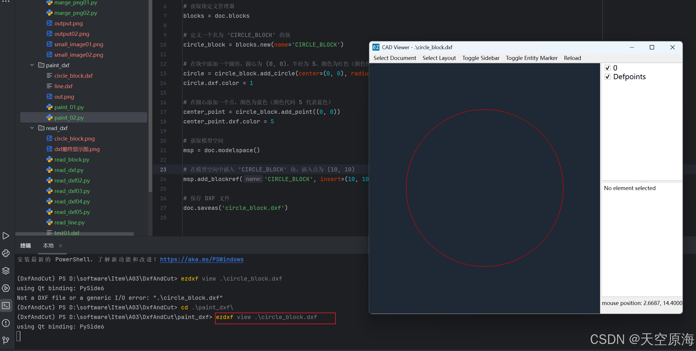 最终会生成两个文件:line.dxf 和 circle_block.dxf ,通过cad看太费劲了,不如直接看