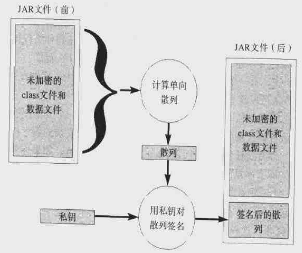 在JAVA语言设计的时候就考虑到要对JAVA编译后的二进制文件进行网络传输,因此基于公钥/私钥机制设计了代码签名和认证的机制,用于保证二进制文件在网络传输过程中不被替换或者修改。对一个jar文件进行数字签名的过程如下图所示: