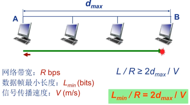 上图中如果B发送数据帧很小,B发送完此数据帧后,由于传播延迟,还没到达D,而B已经结束监听,B会认为没有发生冲突,而其实已经发生了冲突,因为D也向信道上发数了据帧。为什么会产生这种情景,这是因为B发送的数据帧太小造成的。因此在CSMD/CD中有个很重要的概念是:最小数据帧长度。
