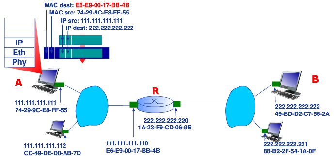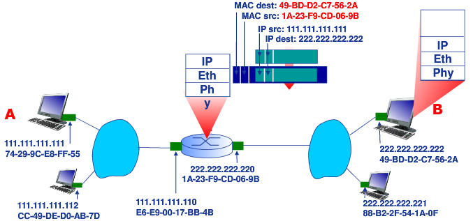 在不同局域网中,数据帧的MAC地址,随路由器的转发而改变。路由器在路由转发的过程中会先建立自己的ARP表。在第一次进行两个节点之间的路由时,它也必须通过构造ARP查询分组去查询对应ip地址的MAC地址。