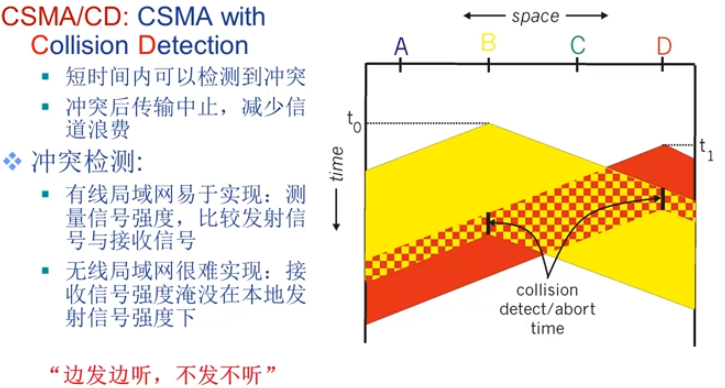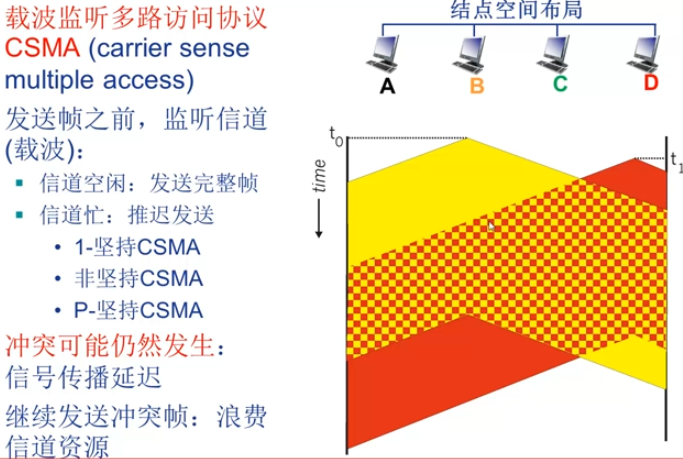 CSMA协议:发送数据之前先监听信道,如果信道有别的节点在发送数据,则不发数据进行等待,等待的方式有三种(1坚持,非坚持,和P坚持)。因为信道有传播延迟,因此CSMA协议存在t0,t1的情况。在此情况中还是会产生冲突,并且BD节点不会(在传输过程中及时的)感知到冲突,这就是CSMA/CD解决的问题。