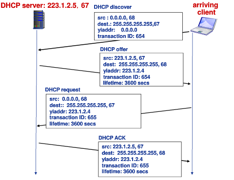 如果采用DHCP协议实现一个DHCP服务器就可以自动配置ip地址了,当然接入主机上必须运行一个DHCP的客户端(我们的个人电脑上,系统的后台运行的进程中应该就有这个客户端进程)。客户端和DHCP服务器进行通信的步骤如下图: