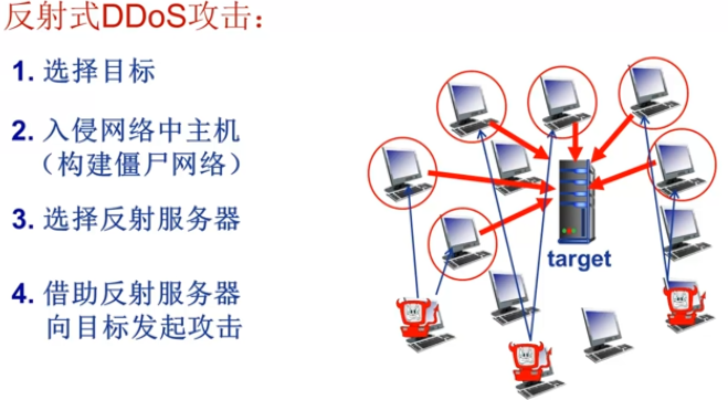 反射式DDOS攻击:控制僵尸网络,选择反射服务器,运用ip欺骗将请求发向反射服务器,反射服务器将服务响应发送给要攻击的服务器。