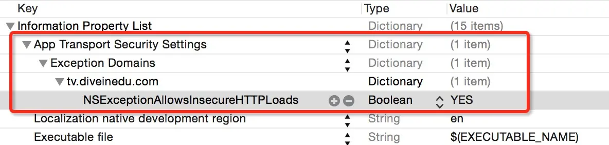 NSAppTransportSecurityNSExceptionDomainstv.diveinedu.comNSExceptionAllowsInsecureHTTPLoads