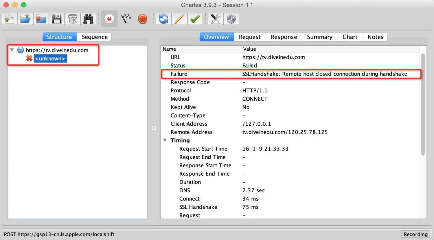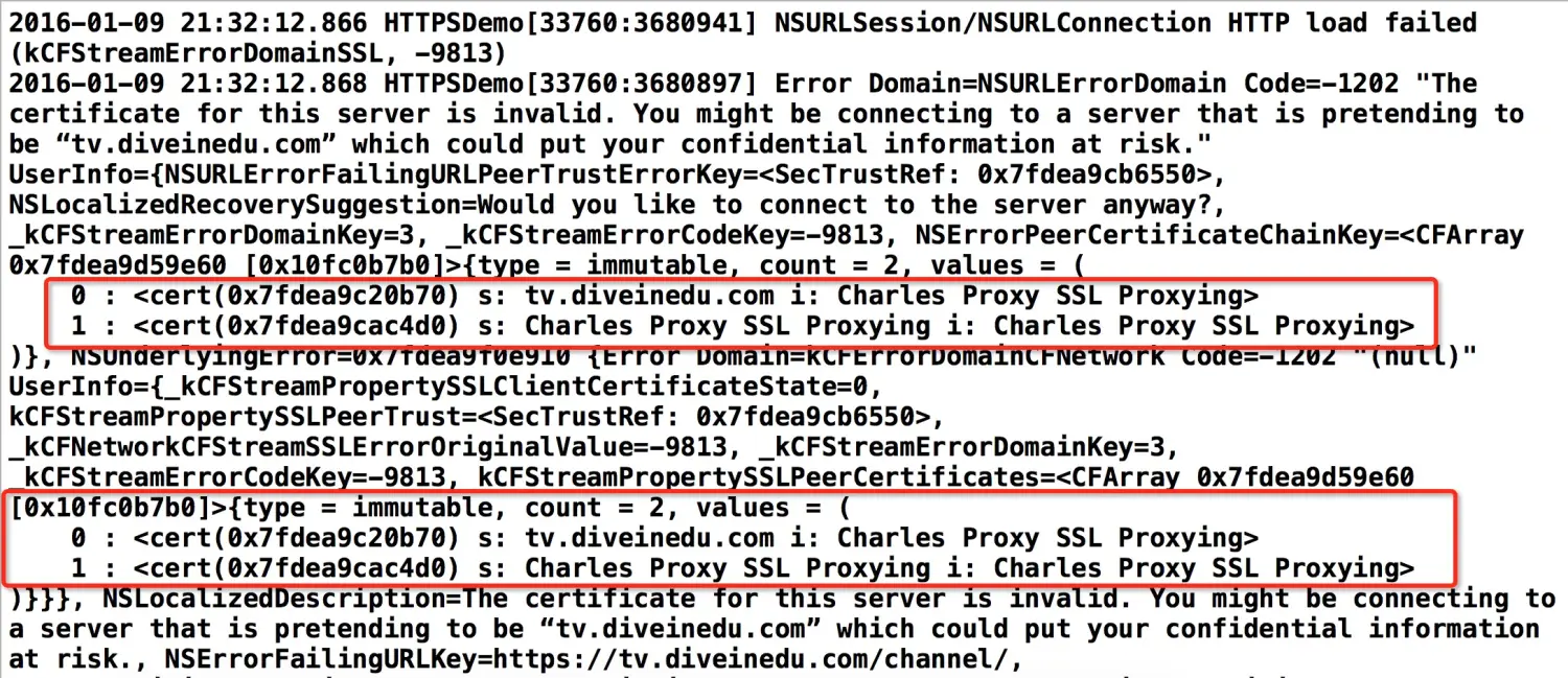 上面的代码能够验证服务器身份在没有使用代理的时候可以正常访问服务器的资源,但是一旦用户给手机网络设置使用了如Charle那样的HTTPS/SSL代理服务,则会出现服务器证书验证失败,SSL网络连接会断开,老板再也不用担心数据接口被人抓包或者代理给扒出来了.故达到防止中间人攻击的效果.