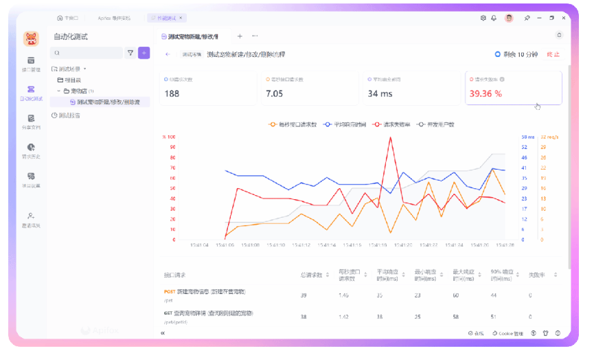 启动性能测试后,Apifox 将会提供一个直观的可视化面板,用以实时监测,并展现关键性能指标,包括 各个接口的总请求数、每秒接口请求数、平均响应时间、最大/最小响应时间,以及 请求的失败率 等信息。