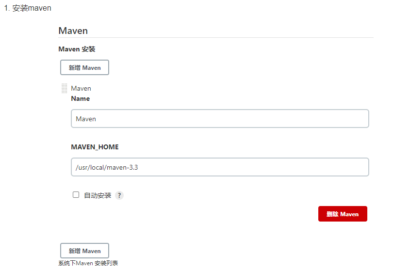 在系统管理-->全局工具配置中添加maven,如果服务器上已经安装了maven,那么指定MAVEN_HOME。