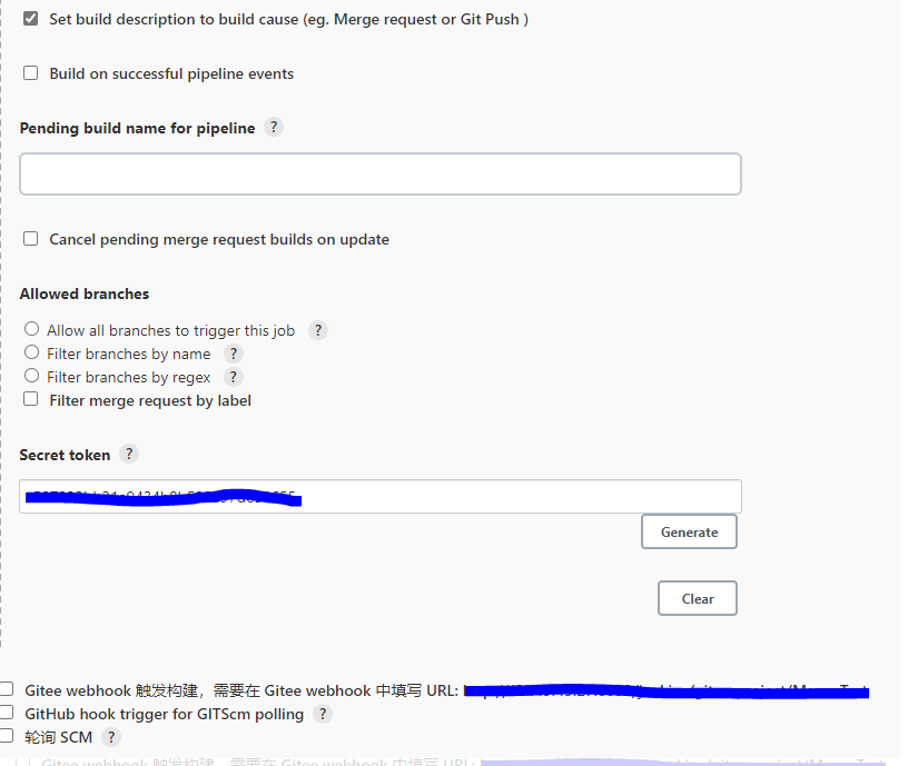在构建触发器-->高级 中,点击generate,生成一个secret token。