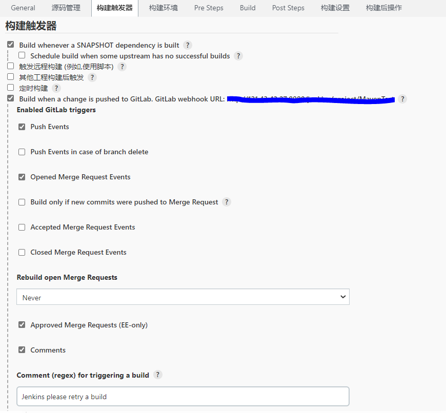 在配置-->构建触发器 中,选中 Build when a change is pushed to GitLab. GitLab webhook URL:***