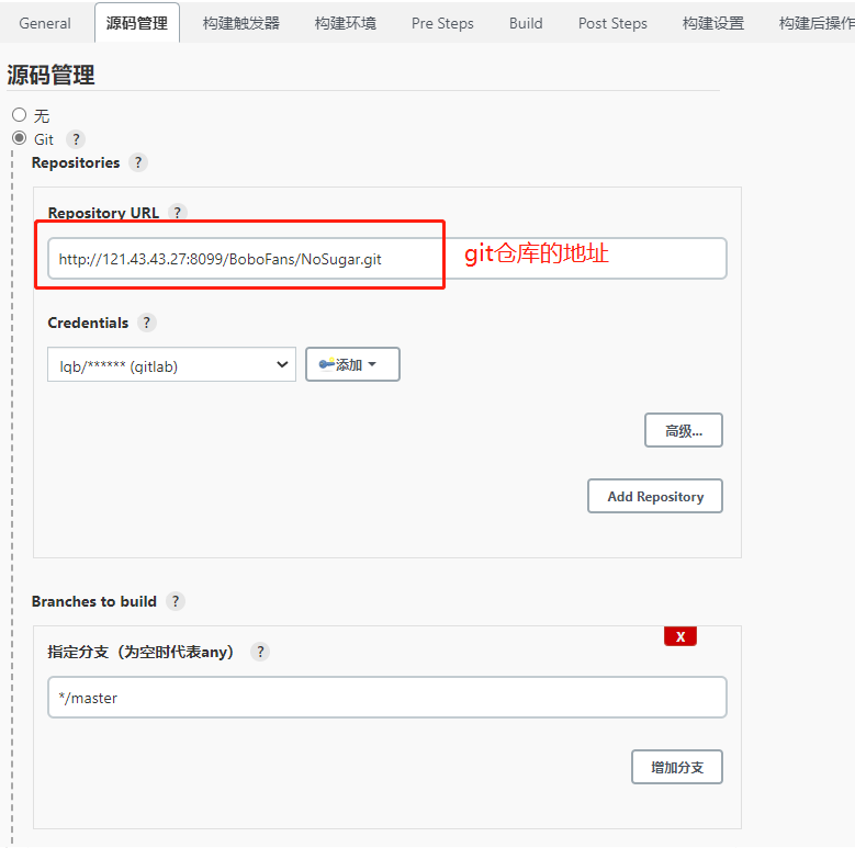 在上面建立的maven任务的:配置-->源码管理 中添加代码仓库。