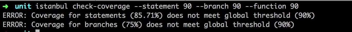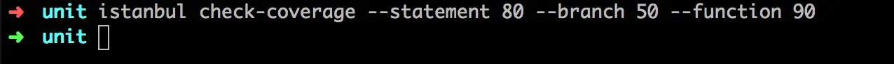 stanbul可以在命令行中设置各个覆盖率的门槛,然后再检查测试用例是否达标,各个维度是与的关系,只要有一个不达标,就会报错。