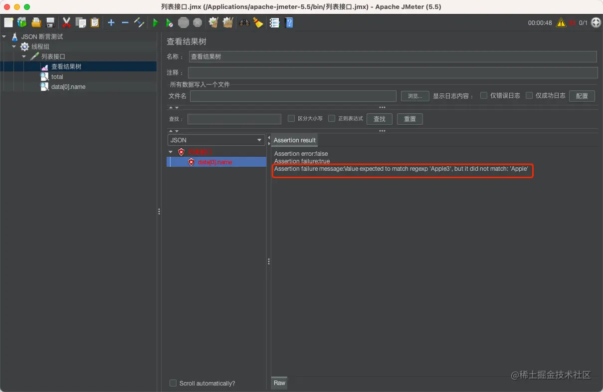 运行用例。如果 响应符合断言,则什么都不会发生。否则,在 结果树监听器 中会看到报错信息。