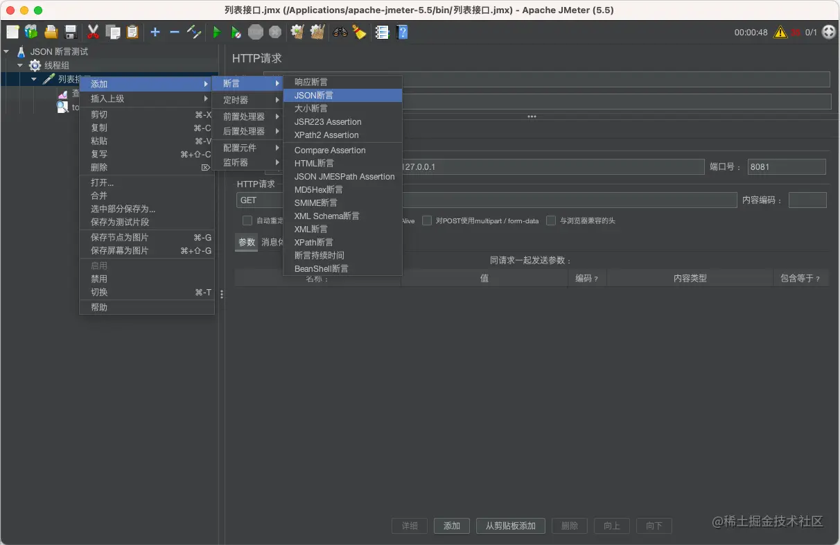 添加 JSON 断言: 右击接口 > 添加 > 断言 > JSON断言。