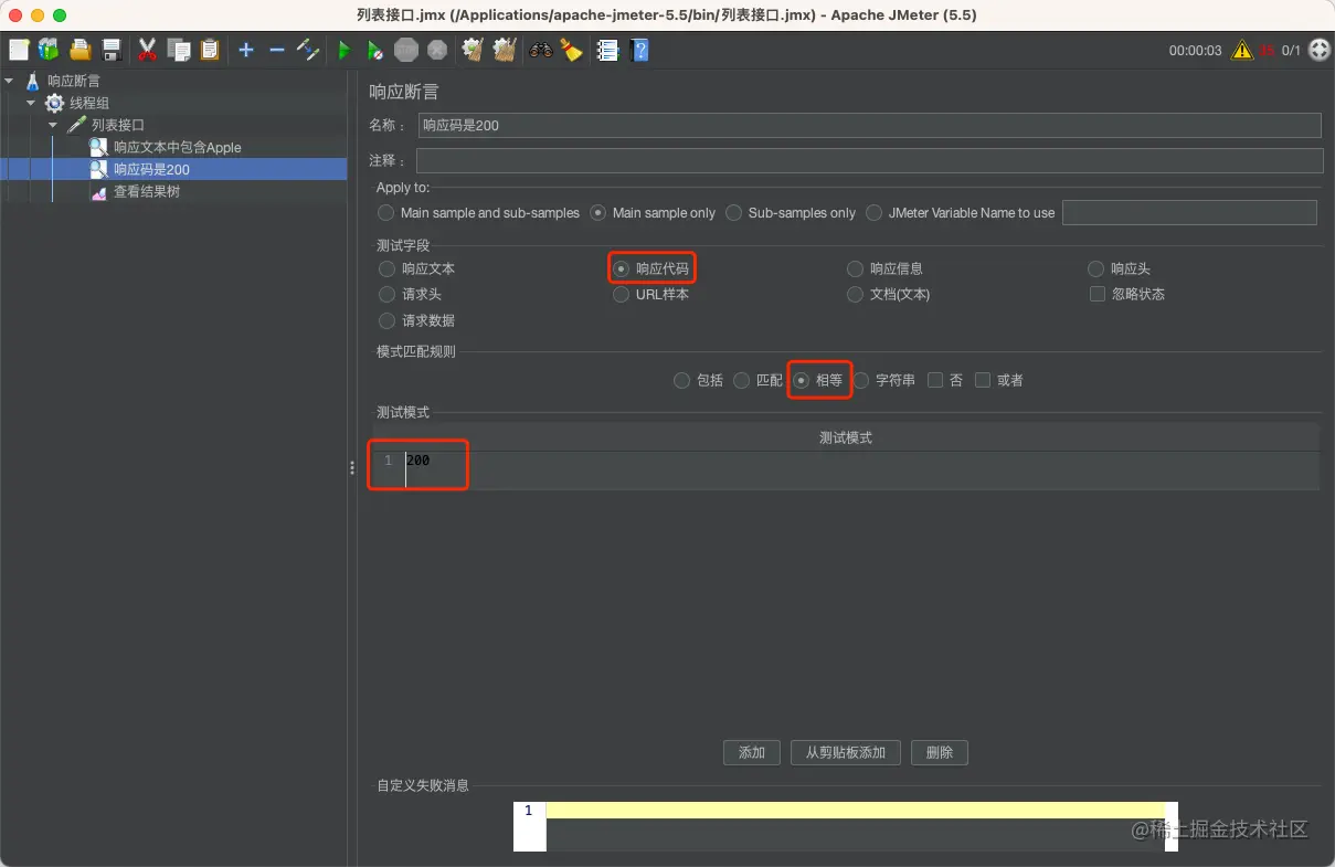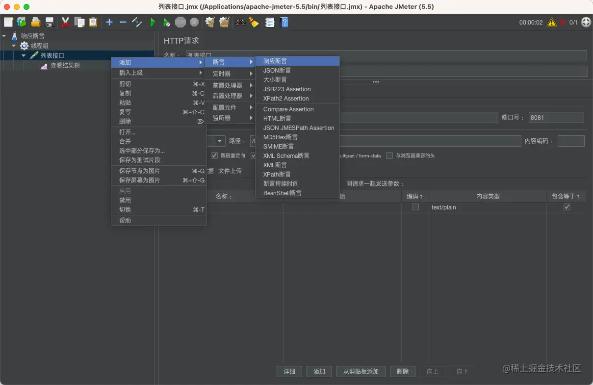 - 响应断言包括:文本、响应代码、响应头、响应时间等。