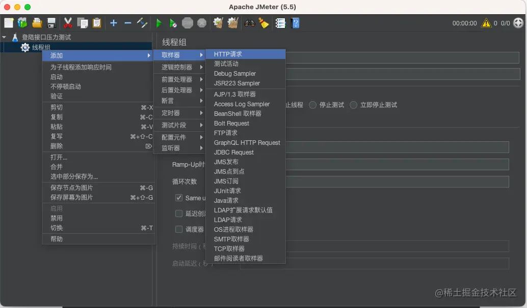 这边以添加 HTTP 请求为例。添加 HTTP 请求,右击线程组并选择:添加 > 取样器 > HTTP 请求。