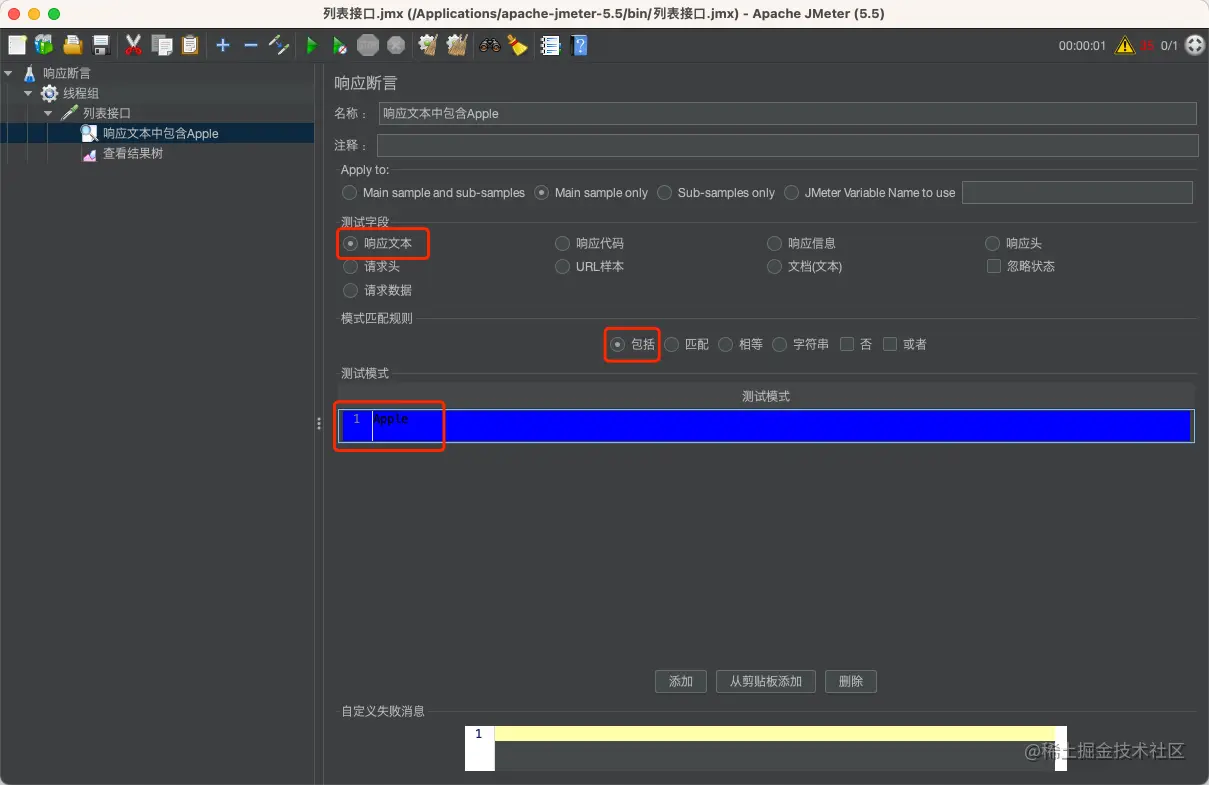 对 响应文本中 包含字符串 “Apple” 做断言: