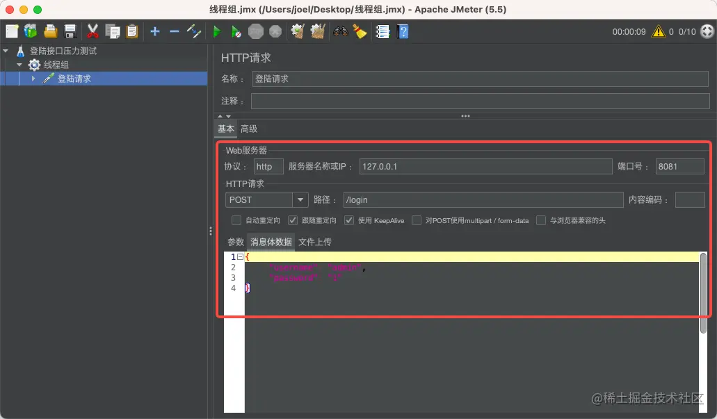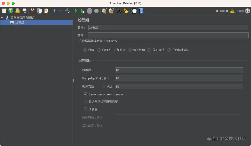 - Ramp-Up 时间 (秒):线程准备时长。如果线程数为 10,准备时长为 10,那么需要 1秒钟启动 1 个线程。