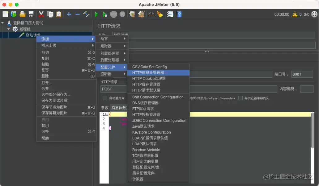 传过去的数据是 json 格式的,因此要添加头信息:Content-Type:application/json。右击 HTTP 请求并选择:添加 > 配置元件 > HTTP 信息头管理。