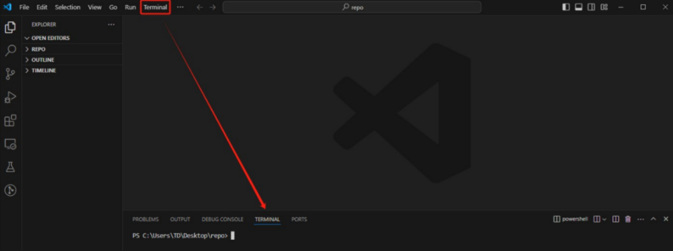 创建一个文件夹作为工作目录,用VScode打开它,然后新建一个Terminal: