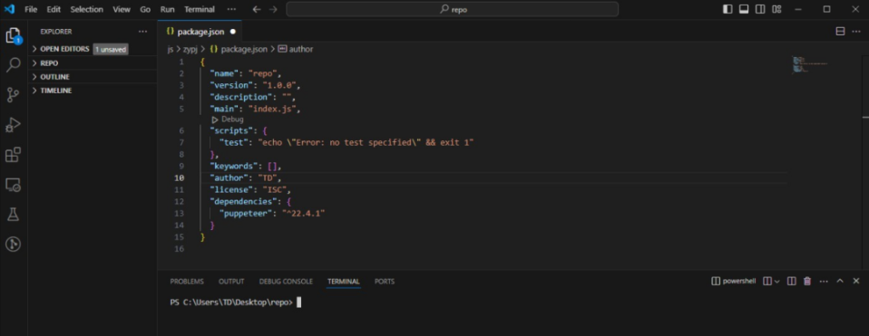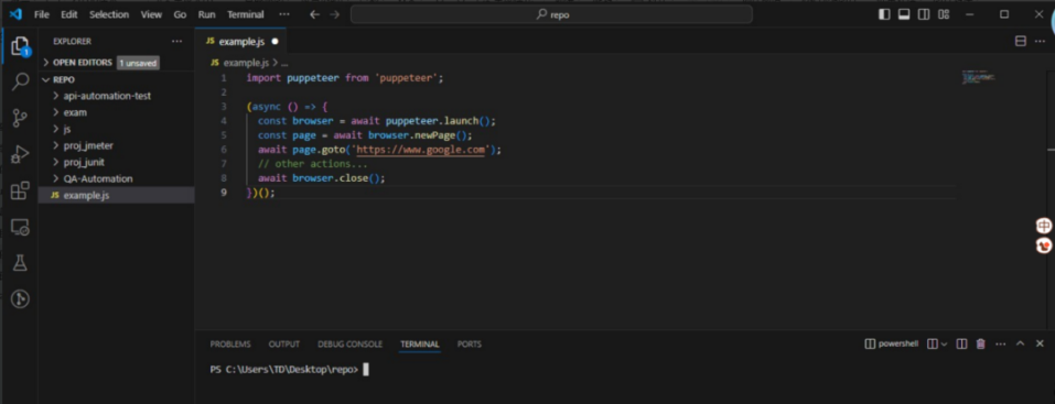 (https://pptr.dev/api/puppeteer.puppeteernode#example)上复制示例代码到该文件中: